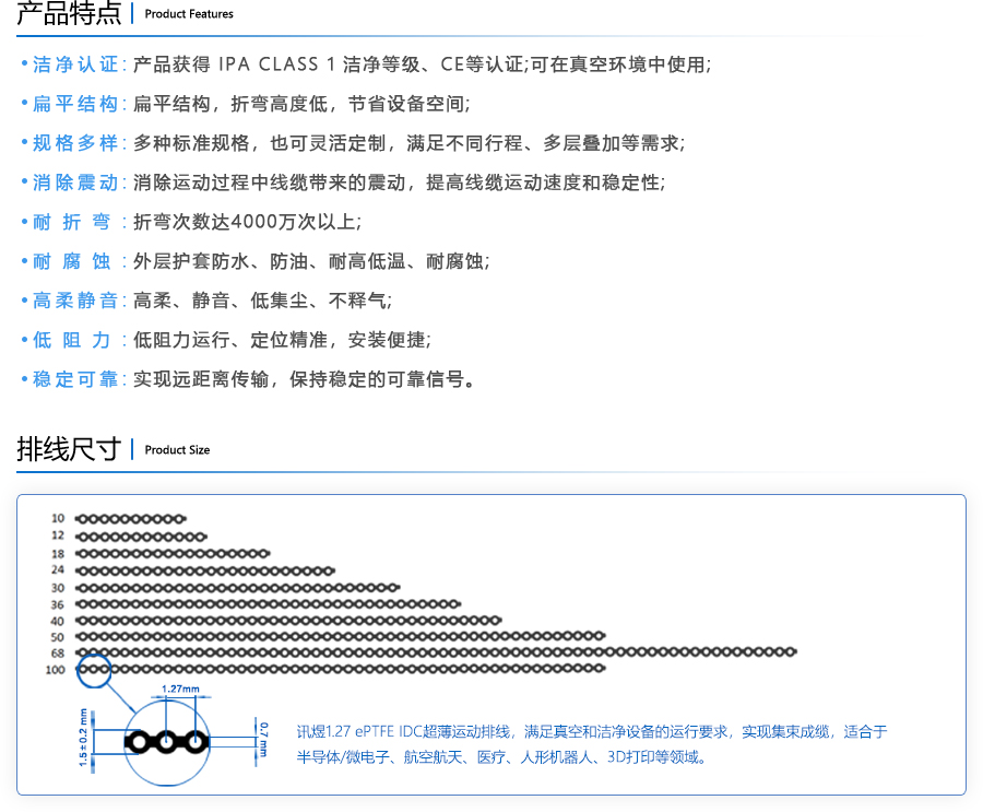 訊煜電子自主研發(fā)的1.27 ePTFE IDC潔凈運(yùn)動(dòng)超薄排線采用潔凈、高柔材料(潔凈等級為IPA Class1,運(yùn)動(dòng)次數(shù)達(dá)數(shù)千萬次),工藝上實(shí)現(xiàn)集束成纜,支持刺破式壓接,產(chǎn)品性能滿足真空和潔凈設(shè)備的運(yùn)行要求,是運(yùn)動(dòng)超薄排線領(lǐng)域的又一次創(chuàng)新!