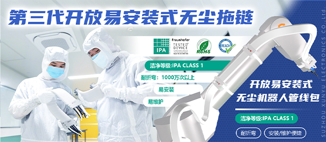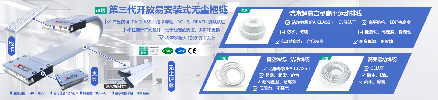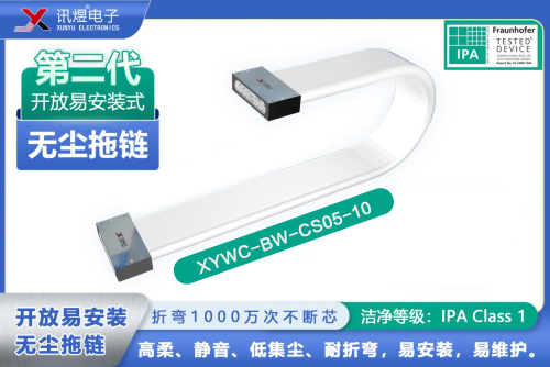 訊煜開放易安裝式無塵拖鏈是一種滿足無塵環境下線纜防護及運動需求的產品,拖鏈自帶屏蔽抗干擾功能(內層采用納米屏蔽材料,吸收拖鏈內部線纜EMI竄擾)。